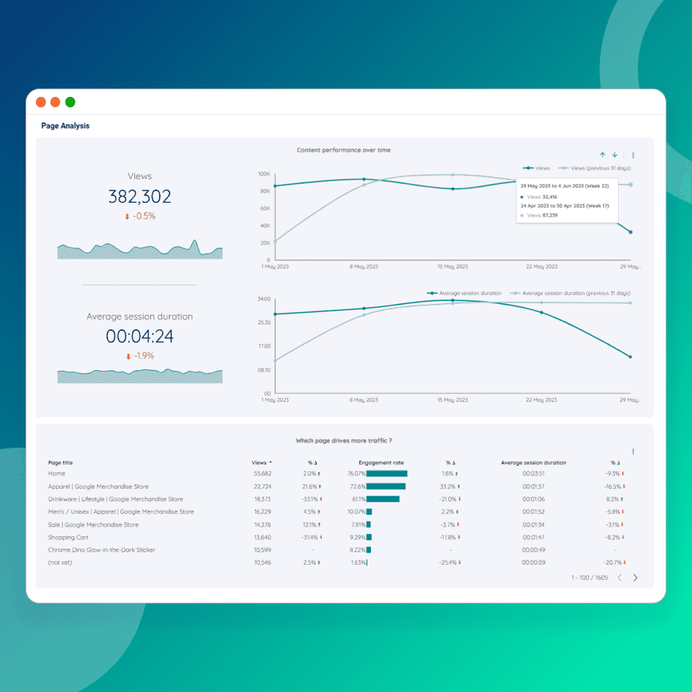 - Channel Performance: Evaluate the effectiveness of your marketing channels in driving traffic, sessions, and engagement over time. Identify top-performing channels and refine your content distribution strategies based on session data, ensuring that your content reaches the right audience through the most effective channels.