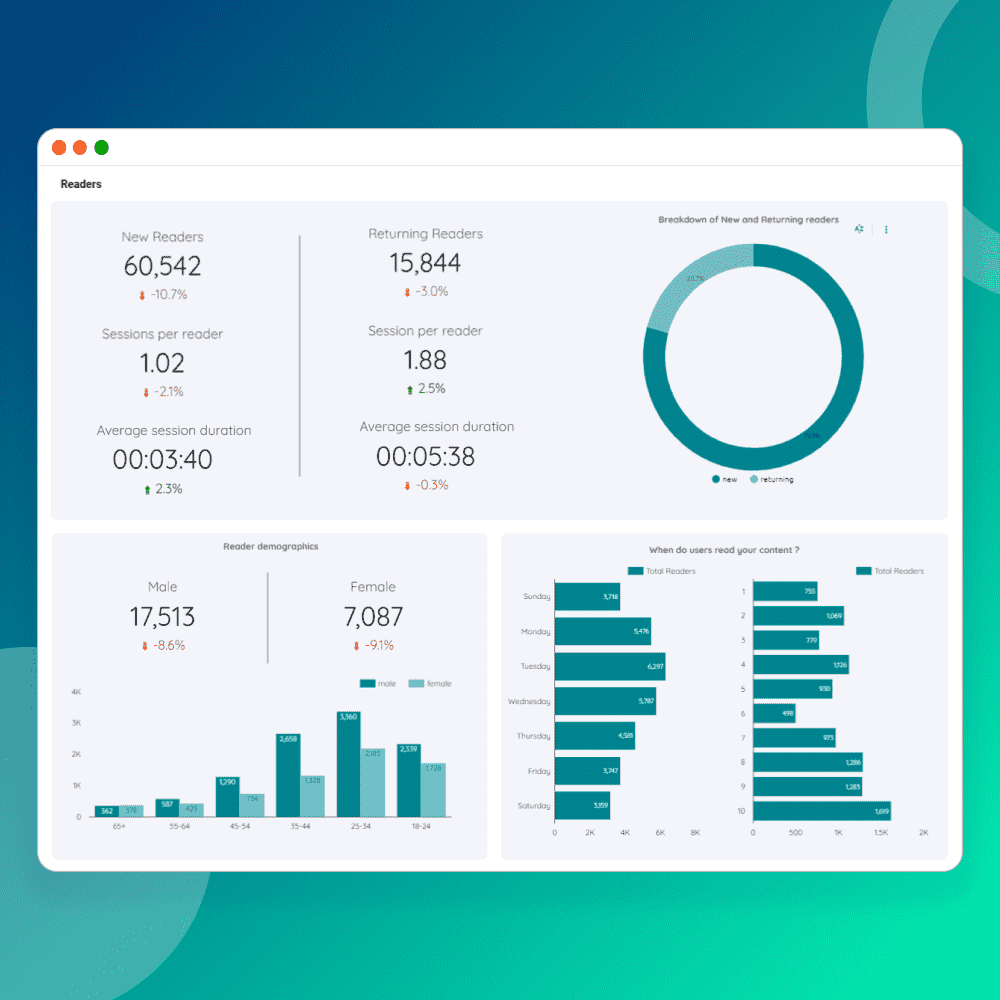 - Readers Insights: Delve into the behavior of your readers, uncovering valuable information about their demographics, preferred channels, and peak session activity.