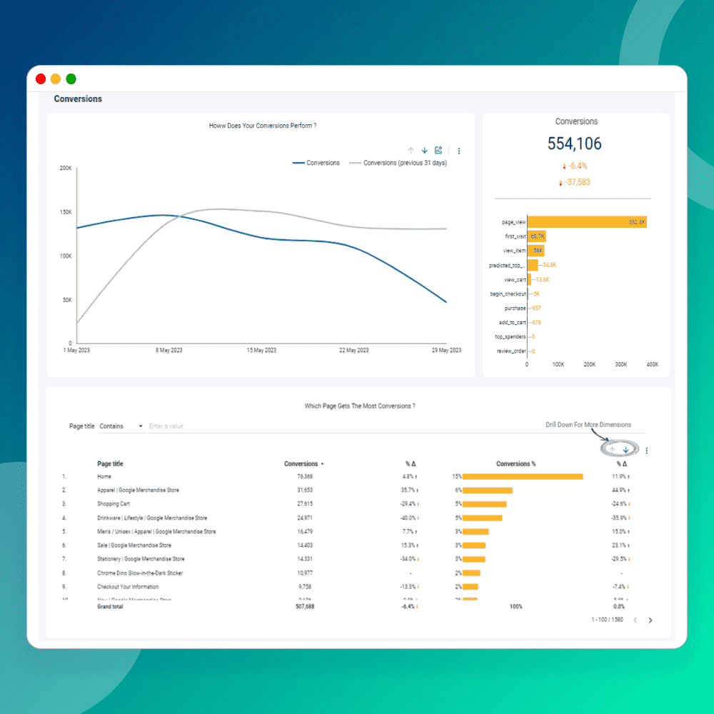 - Conversions Tracking: Keep a close eye on conversions to assess the effectiveness of your digital campaigns, all within the GA4 Looker Studio template.
