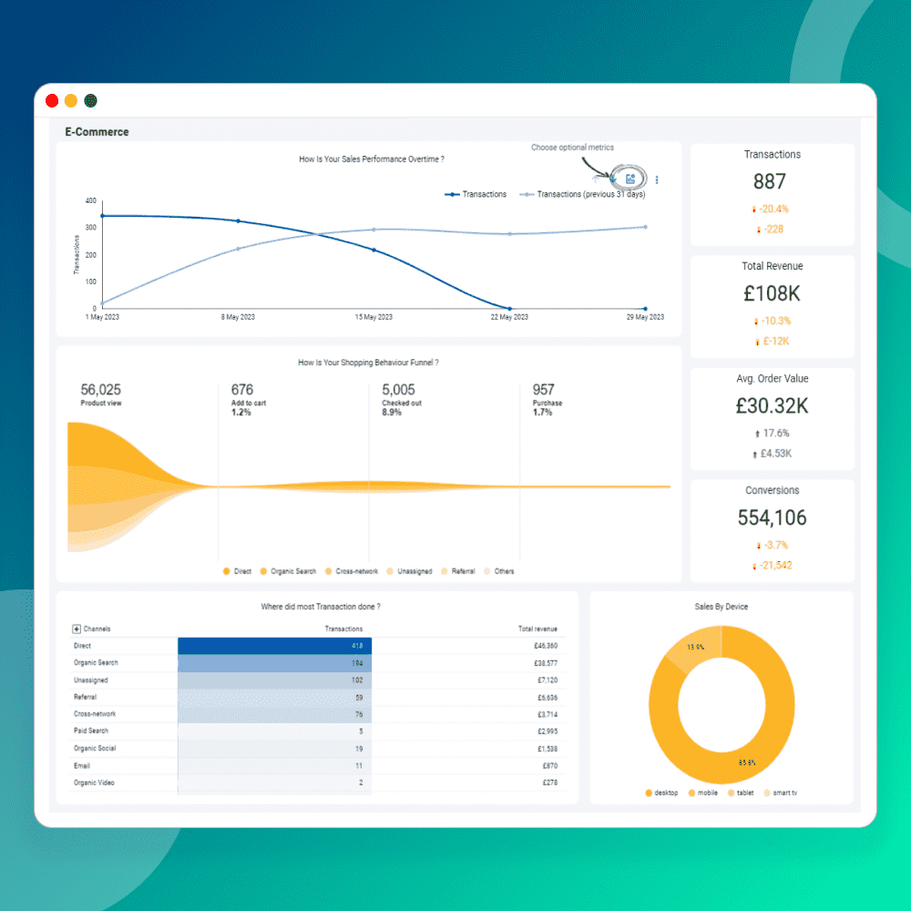 - Ecommerce Insights: Gain valuable insights into revenue, average order values, purchase behavior, and product performance. Using this information, you can make well-informed decisions to boost sales and enhance the overall customer experience.